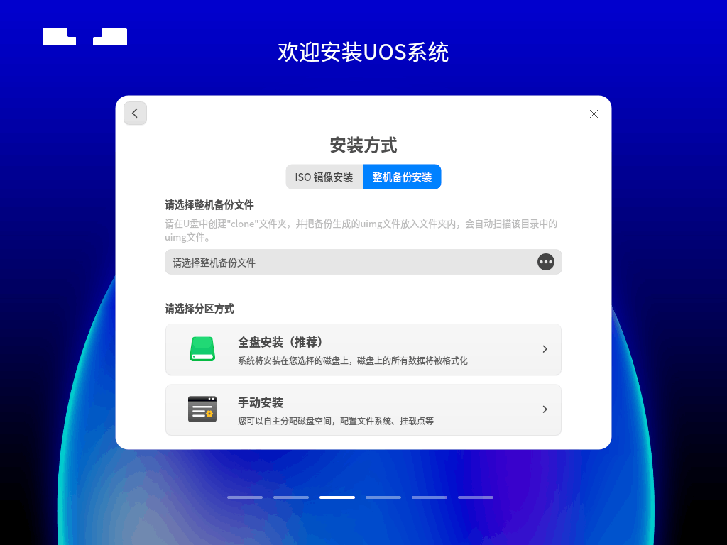 第二步:部署映像文件(UIMG),需要用到“安装器”。选择光盘、U盘等任意安装介质,正常启动安装盘并选择“整机备份安装”选项,再按照引导提示操作选择映像文件(UIMG)并执行安装即可。