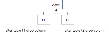 alter table t1 drop column需要将view1置为无效,alter table t2 drop column也需要将view1置为无效,此时置为无效需要修改pg_rewrite系统表,因此对视图持八级锁,两个alter table操作只能有一个持八级锁,另外一个就会等待。如果持锁的alter table持锁周期过长,另外一个就无法执行。