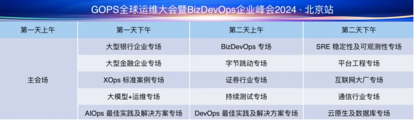 大会将为期2天,侧重 BizDevOps、AIOps、DevOps、持续测试、SRE、云原生等热门技术领域。特设了如大模型 + 运维、银行/证券数字化转型、平台工程、DevOps/AIOps 最佳实践、通信行业专场、互联网名企等特色专场。
