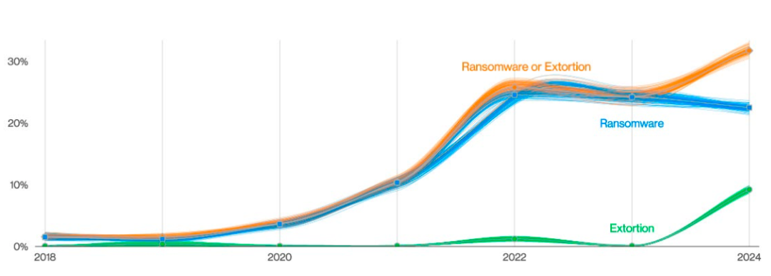 此外,2024DBIR注意到,无加密勒索攻击在持续增长,在这种攻击模式下,攻击者不再加密文件,而是窃取敏感数据作为勒索的筹码,这带来新的挑战,且从长远来看,这一方式将日益普遍。