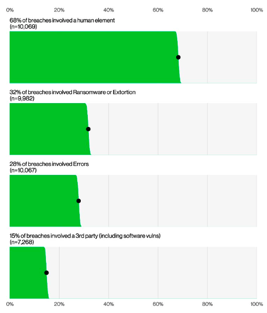 这种模式往往涉及更加专业的网络攻击者,他们利用在黑客攻击和恶意软件方面的专业知识来渗透/破坏/影响不同规模的组织,并经常利用勒索攻击获取报酬。今年共计有5,175 起系统入侵事件,其中3,803 起确认存在数据泄露的情况。
