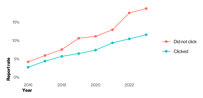 网络钓鱼曾多次被DBIR报告强调,今年2024DBIR则发现,用户越来越善于识别网络钓鱼企图。