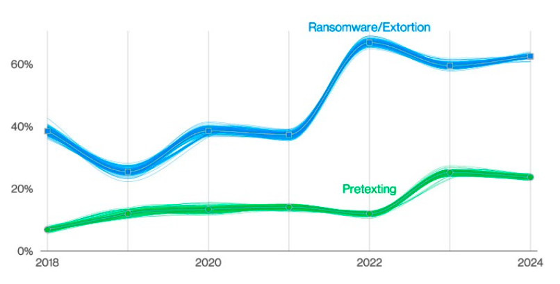社会工程事件中,超过40%的事件涉及假托(pretexting),31%涉及网络钓鱼。由于大规模的MOVEit事件,通过社会工程进行勒索活动也急剧增加。同时,商业电子邮件入侵(BEC)攻击作为低成本、高回报的攻击方式,正在给组织带来严重的经济损失。