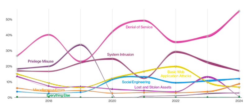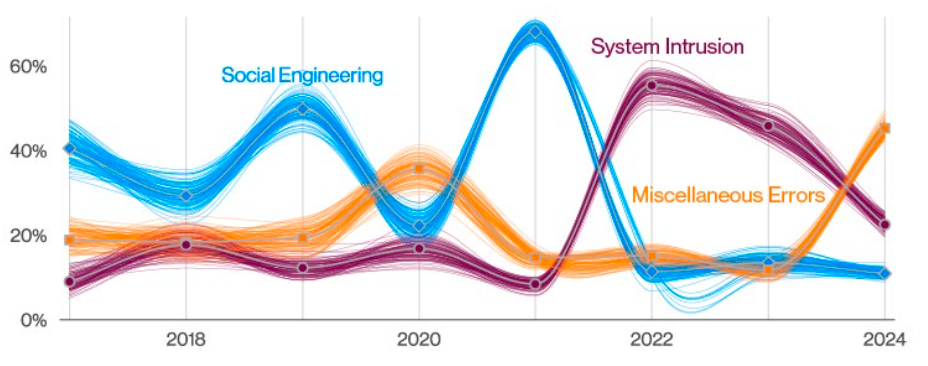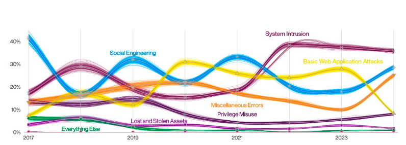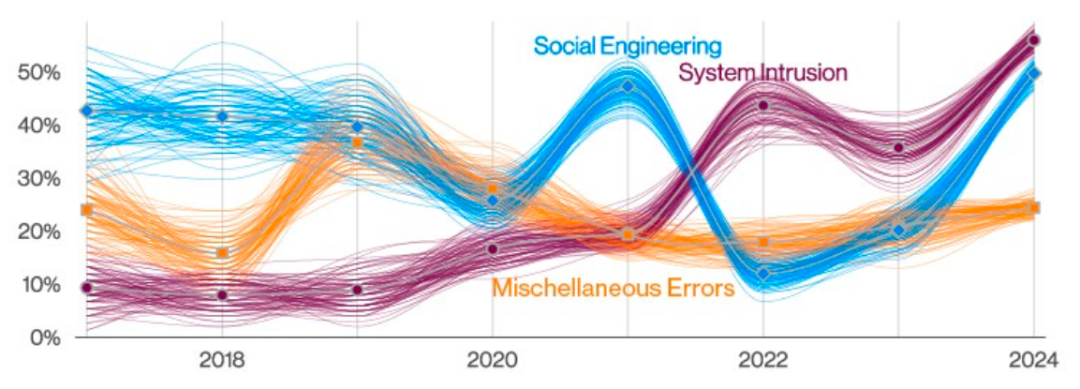 2024DBIR报告中则分为:基本Web应用程序攻击、拒绝服务、资产丢失和窃取、杂项错误、特权滥用、社会工程、系统入侵、其他共八种模式。