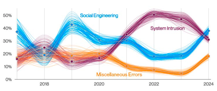 2024DBIR指出,经济利益驱动下,攻击者愈发青睐使用能高投资回报率的攻击技术手段。