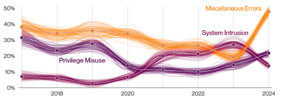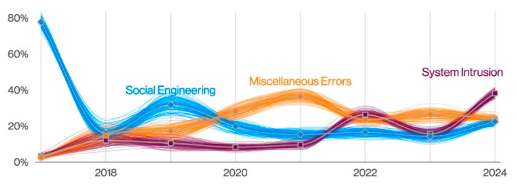 杂项错误已飙升至该行业的首位,反映了该行业内部违规行为的普遍性。系统入侵现在排名第二,勒索软件则是最常见的外部攻击手段之一。