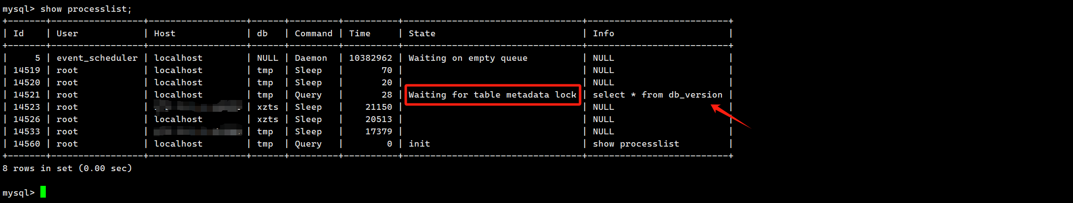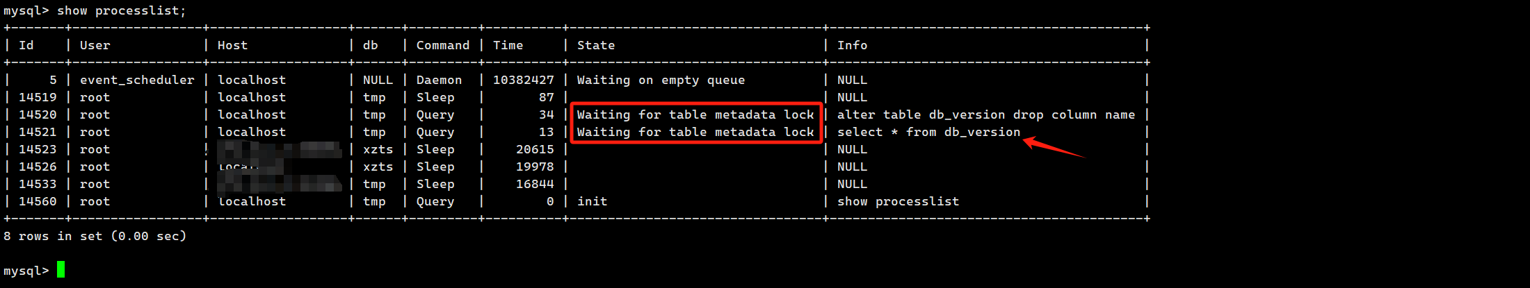 Waiting for table metadata lock: 可以参考元数据锁互斥而导致的表不可读写处理。这种情况主要出现于因 FLUSH TABLES 而等待后,执行 DDL 语句如 ALTER TABLE。