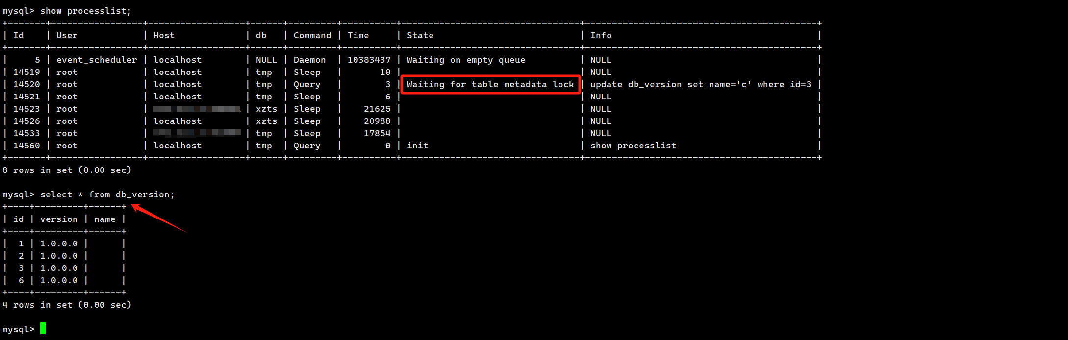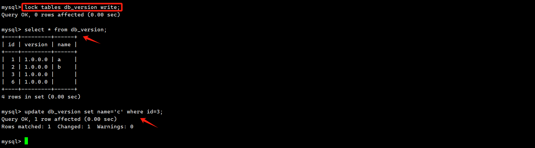 会话 1 执行:lock tables db_version write;