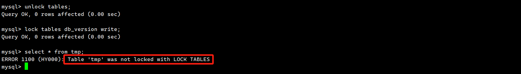 当 LOCK TABLES 后,执行 FLUSH TABLES 会被阻塞,从而导致表对象不可读写。