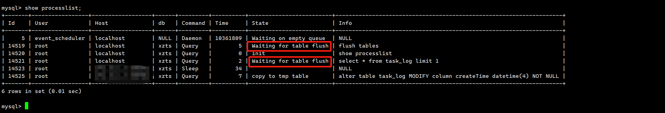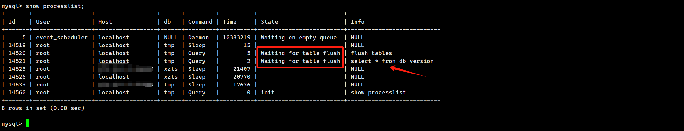 Waiting for table flush: 可以按如下方式寻找源头。这种情况主要出现于因 FLUSH TABLES 而等待后,执行 DML 语句。