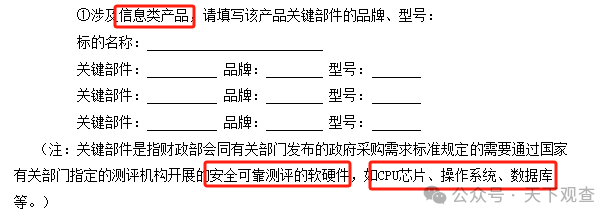 在合同中明确说明:涉及信息类产品,填写该产品关键部件的品牌、型号。关键部件是指...需要通过...安全可靠测评的软硬件,如CPU芯片、操作系统、数据库等。