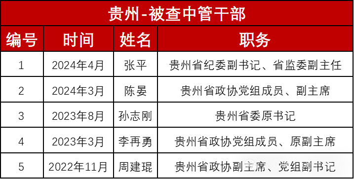 根据中央纪律检查委员会、国家检查委员会公布的审查调查信息,自二十大(2022年10月)以来,贵州省被查的中管干部已有5人,被人戏称“贵州中管五虎”涉及省委书记、纪委副书记、政协副主席、贵阳市长等政府要职。
