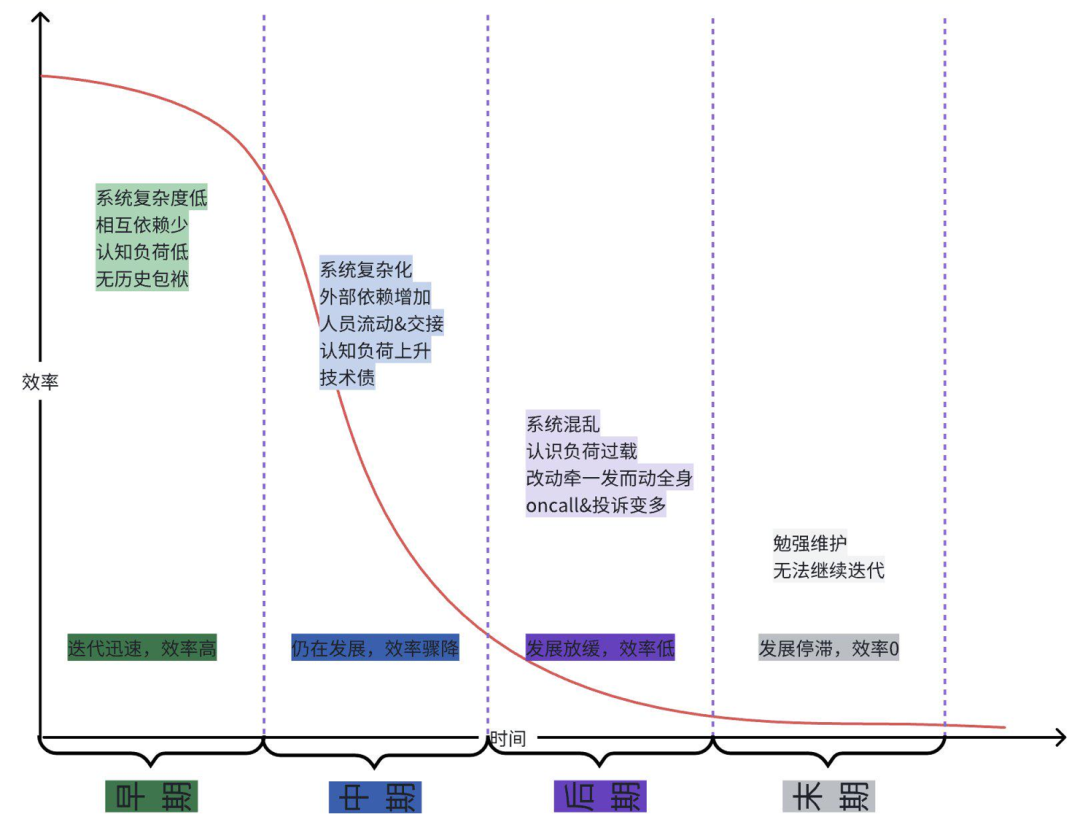 在项目的早期迭代非常迅速,一个需求可能一周就可以完成开发测试与上线,研发效率也保持在较高的水平。此时一切还都是有序的状态。随着功能的迭代,模块与模块之间、功能与功能之间可能会出现联动与复用的逻辑,如果不加以重构,可能就慢慢变成了技术债。加上人员投入增加与人员流动,新人可能对原来的设计思路并不了解,会出现仅看代码无法了解功能的情况,认知负荷开始上升,慢慢的会发现虽然投入的人力增加了,但是研发的效率开始越来越慢。系统混乱开始慢慢增加。虽然效率降低,但是功能的迭代还在进行。但即使只是一天就能搞定的小需求,涉及到的改动也会有多处,且不确定要改多少个地方才能保证系统的正常运行。此时整个系统的认知负荷已经过载,仅仅写好代码还不够,还需要清晰地了解历史代码的功能逻辑,否则稍加不慎就会引入oncall或者投诉。随着oncall的增多,研发的人力又被占用,进一步降低了研发效率,需要额外的时间偿还技术债。此时系统已经变得非常混乱,即将变为无序状态。随着混乱的进一步恶化,团队的战斗力几乎归零,仅能够维护现有功能,新增需求很难在短时间内完成开发上线。产品的发展技术陷入停滞,效率几乎降为零。此时系统已经变为完全混乱的状态。