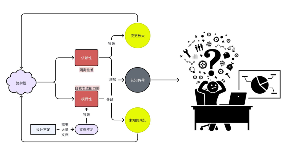 导致复杂性的原因可以概括为两个方面:依赖性与模糊性。过多的外部依赖导致功能变更的放大,并会增加认知负荷,而信息的模糊会增加未知的未知。而这些表象又会反过来提升系统复杂性,以此往复加速系统的“衰败”。
