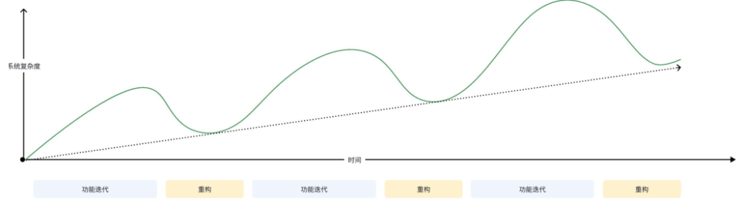 系统从有序到无序是必然的,那只能任由代码变坏而束手无策吗?幸运的是答案是否定的。软件工程已经发展了60多年,我们遇到的问题,前辈们肯定也遇到过,我们有充分的理论和方法来对抗系统的逐渐混乱。如下图所示,虽然系统复杂度上升是无法避免的,但是适时的重构可以减缓系统混乱的速度。