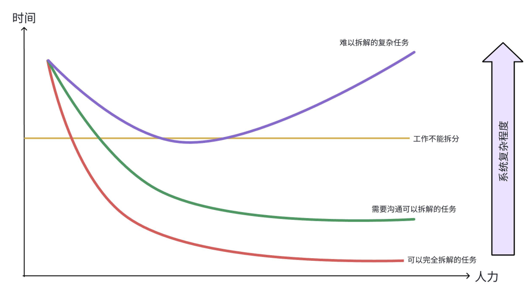 随着混乱的增加,团队生产力也持续下降,趋向于零。当生产力下降时,管理层就只有一件事可做了:增加更多人手到项目中,期望提升生产力。对于可以拆解的任务,增加人力确实可以缩短交付时间提升效率。但对于复杂的系统,新人并不熟悉系统的设计,他们搞不清楚什么样的修改符合设计意图,什么样的修改违背设计意图。而且,他们以及团队中的其他人都背负着提升生产力的可怕压力。于是,他们会制造更多的混乱,驱动生产力向零那端不断下降。因此,可以说补充人力在一定条件下是可以提升整体的进度与效率,但这并不绝对,特别是对于混乱的系统。