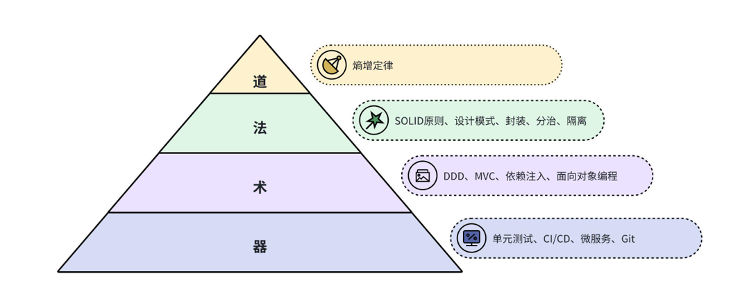"道"是指宇宙万物的根本原则,也可以理解为事物运行的规律和基本法则。不以人的主观意愿而转移。熵增定律可以被视为一条使整个宇宙变得绝望的法则,它被理解为事物结构不可避免的逐渐衰退。熵增定律无法避免,就像生老病死无法避免,但是我们可以通过一些手段,延缓“最终无序”的到来。"法"是指宇宙和人生的治理法则与方法论,对应到代码开发中可以归类为一些经典的原则与思想。软件工程经过60多年的发展,沉淀了很多有指导意义的方法论。比如SOLID原则、各种设计模式,以及大道至简的架构设计思想:抽象、封装与隔离。这些方法论都可以助理我们进行代码重构,及时降低系统的复杂程度。"术"指的是技能、技术和实践方法。在软件开发中,"术"可以表示编程技术、框架的使用、代码架构等。方法论往往都是思想上的指导,不同的人可能也有着不同的理解,真正落地的时候还需要一些业务框架与编程范式,比如有领域驱动设计、MVC架构、依赖注入与面向对象等。这些原则都可以帮我们更好的进行代码分层与依赖反转,进而实现高内聚、低耦合的业务代码。"器"是指工具和资源,用于实践和应用"道法术"的原则。在软件开发中,"器"可以包括开发工具、版本控制系统、自动化测试工具等,采用微服务架构可以更好的实现功能的隔离,而单元测试与CI/CD则可以更好的加速功能的迭代与系统的重构。无论是方法论层面还是工具层面,目前都已经很成熟了。在写代码的时候多加一步思考,在功能完成之后对业务代码进行适当的重构,就会达到很好的效果,也应当成为一种习惯。
