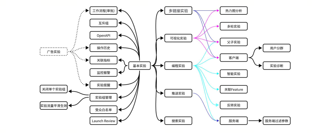 接口中,可以视后续迭代而定。版本管理作为实验比较核心的模块,也可以看做是基础能力,因为实验的本质就是管理一系列不同的差异化配置,然后结合线上流量看效果。和实验版本相关的功能都可以在该实体中实现或者扩展,比如关闭单个实验组、可视化实验下页面信息编辑等。其中,白名单和版本息息相关,因此将白名单相关处理逻辑放到该版本管理模块下进行统一处理。另外对于穿山甲特殊场景,需要加载预置版本配置,这种场景在实际设计的时候需要注意其通用性。实验层管理部分后续会统一放到实验仓库里面维护。目前实验中只有对层的一些简单操作与校验功能。指标管理和版本管理类似,都是实验过程中比较重要的模块。在该模块中主要处理指标的增删改查与关联关系的维护,比如实验指标关联关系、实验与指标组关联关系等。目标受众也即实验模块中的filter条件,用于对请求的用户做路由配置。由于其涉及到的业务逻辑较多,因此单独抽出TargetRule实体对这部逻辑进行处理。后续还将负责过滤条件的参数转换(backend)与一些关联条件的创建,比如过滤条件与分群、服务端过滤参数的关联关系等。/ 业务流程