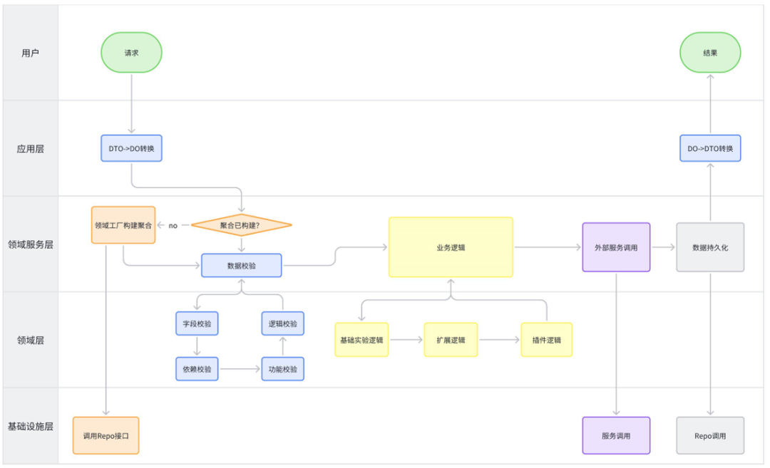 在系统分层中,各个模块负责的主要功能大致如下图所示。不同层各司其事完成业务逻辑,下面示例示例代码为实验开启接口对应领域服务的具体实现。