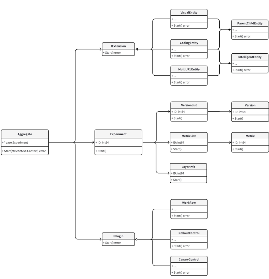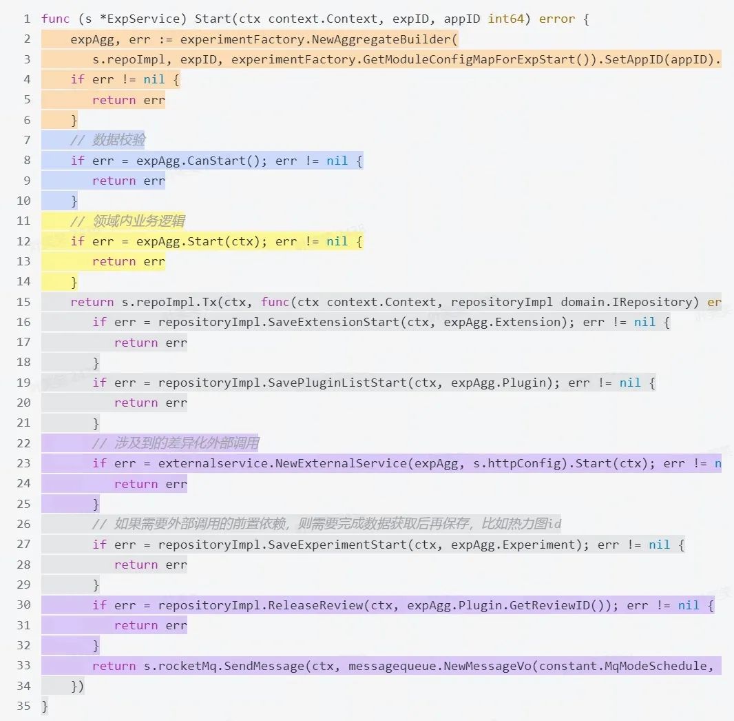 下面用实验开启的业务逻辑为示例作说明。由于采用了面向对象的编程方式,业务模型也叫编程“充血模型”,每个实体都拥有丰富的方法。而对实验开启的操作,也按照上面的划分从三个模块进行操作,每个模块直接或者间接的提供了Start方法,进而完成整体的业务。具体到extension与plugin部分,在聚合中依赖统一抽象的接口,不关注其具体实现,具体是编程实验还是可视化实验,亦或是加入了精准熔断或者实验审批,都将通过统一的方法调用完成相应的业务逻辑。另一方面,由于不同的扩展和插件通过接口的方式做了隔离,后续新增模块或者修改部分模块的操作,将会变得非常容易,只需要关注当前的修改即可,不用担心影响到其它模块。在业务执行的过程中,整体业务逻辑呈现从上到下、逐级划分的一个过程。一个功能将层层拆分最终落到一个单一职责的函数或者方法中,这与组织管理有着异曲同工之处。这样一来函数或者方法将尽可能的复用,单一功能的函数或者方法将更容易测试。这种从上到下的实现方式,和滑铁卢编程风格中所属的关注数据流动非常类似,上层只需要做好任务的拆分,底层按照要求实现即可。最终开发者只需要关注单个功能的实现,将大大降低认知负荷,更容易规避潜在的bug。我偶然发现了一种极其强大的编程哲学,那就是你应该忽略代码,那只是计算机要遵循的一大堆指令。相反地,你要专注于数据,弄清楚它如何流动。--《滑铁卢编程风格》