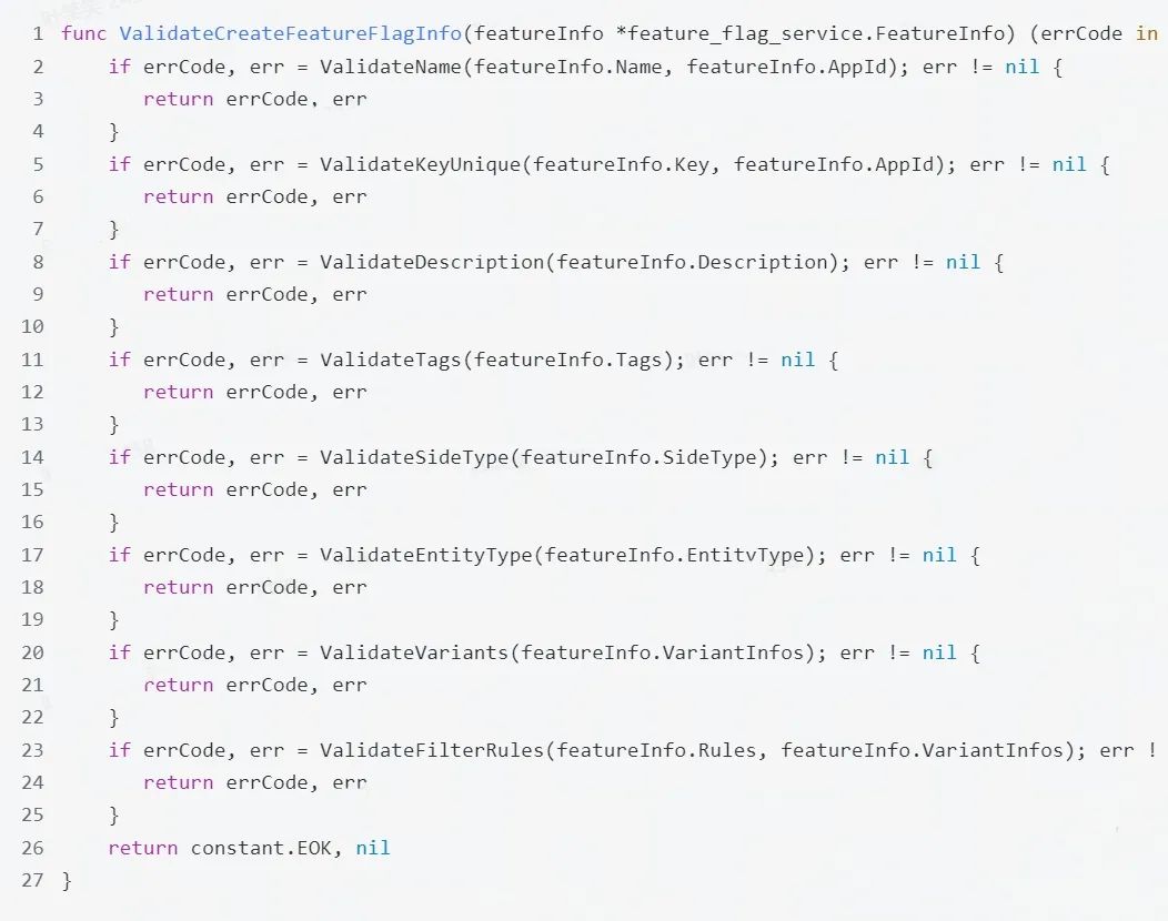 首先看下通常数据校验是如何实现的,以下是在tob侧老版本feature flag中的校验方法。如果一次请求包含的实体或者值对象不完整,那么就会出现很多是否设置某些字段的判断;且创建需要的校验与更新所需的校验需要分开处理无法复用。这种校验虽然能够实现校验的功能,但是新增校验字段可能需要在创建与更新等校验函数里面做同步改动,如果有遗漏就会出现问题。那么就需要考虑一种机制能够按需校验,根据设置字段自动构建构建函数完成对参数的校验。通常校验逻辑会写在正式的业务逻辑之前,但考虑到数据有依赖关系以及校验需要完整的领域模型,因此此次 DataTester 重构将数据校验作为聚合的一部分。为了实现业务逻辑与数据校验的完全解耦以及更好的支持后续的扩展,本次通过Validator对象实现了自动校验机制。后续会根据实际情况进行优化,拆分出一些不需要外部调用就可以进行判断的校验参数,以便能够做到及时返回