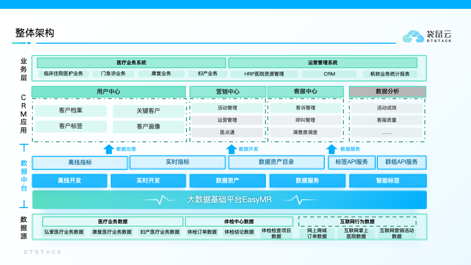随着大数据、云计算、5G、人工智能、物联网等技术发展,数字化在医疗场景中的价值日益显现。为了提供更好的医疗健康服务,建发弘爱与袋鼠云达成合作,依托于建发集团大数据平台应用搭建大数据平台计算节点,整合互联网联盟平台据、体检中心和严肃医疗三大业务数据,基于大订单模型升级了互联网客户的客户关系数据域,进而对CRM进行了能力升级,此外还开发了机器学习智能推荐服务和指标报表开发功能。