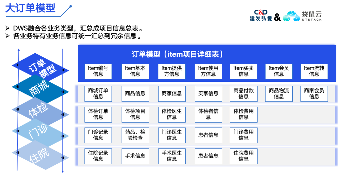 从数据生命周期角度出发,采集医疗业务数据,通过数据中台统一加工、处理,按照“证件类型+证件号+加密算法生成”的规则为用户赋予唯一ID,从而将不同系统中的用户数据打通,并依照大订单模型理念与之串联弘爱搭建了互联网客户及互联网订单数据中心形成数据资产。