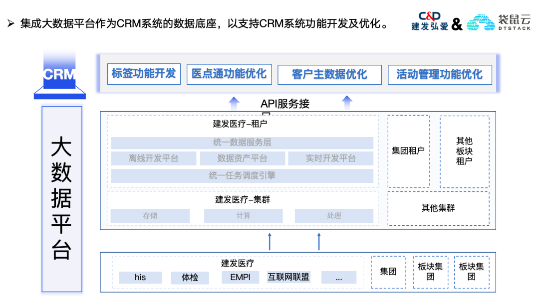 集成大数据平台作为CRM系统的数据底座,以支持CRM系统功能开发及升级优化,建设医疗标签体系,实现标签按日期、标签阈值筛选组合,生成可自定义标签维度的客户清单,并将标签客群创建、客群选择功能嵌入到闭环营销流程中,对用户进行跟踪分析。方便制定、优化营销和运营策略,并及时进行后链路数据分析,从而促使集团更好地为用户提供医疗和健康全生命周期解决方案。