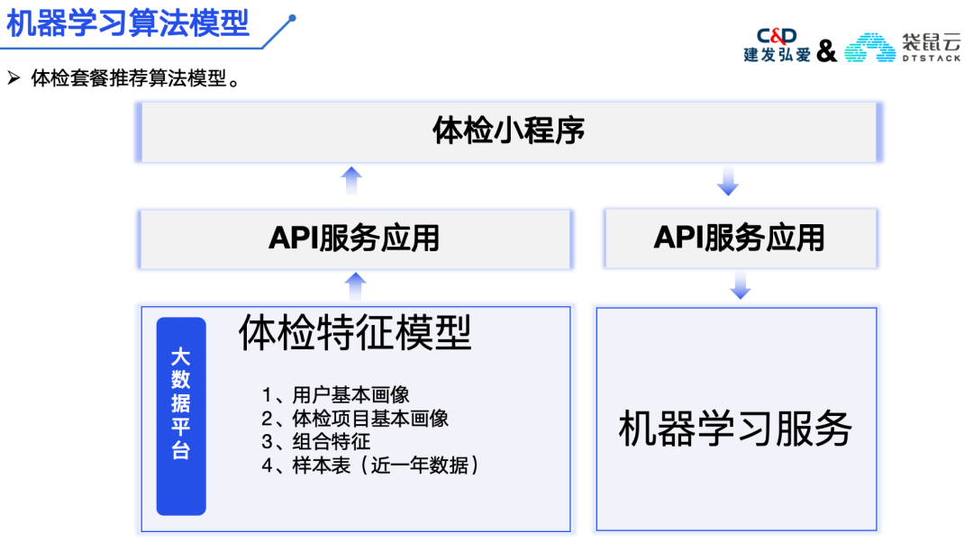 以用户中心出发,结合大订单模型数据设计体检特征模型,为算法服务提供基础数据支撑,打通数据平台、算法服务、应用端数据链路形成闭环。