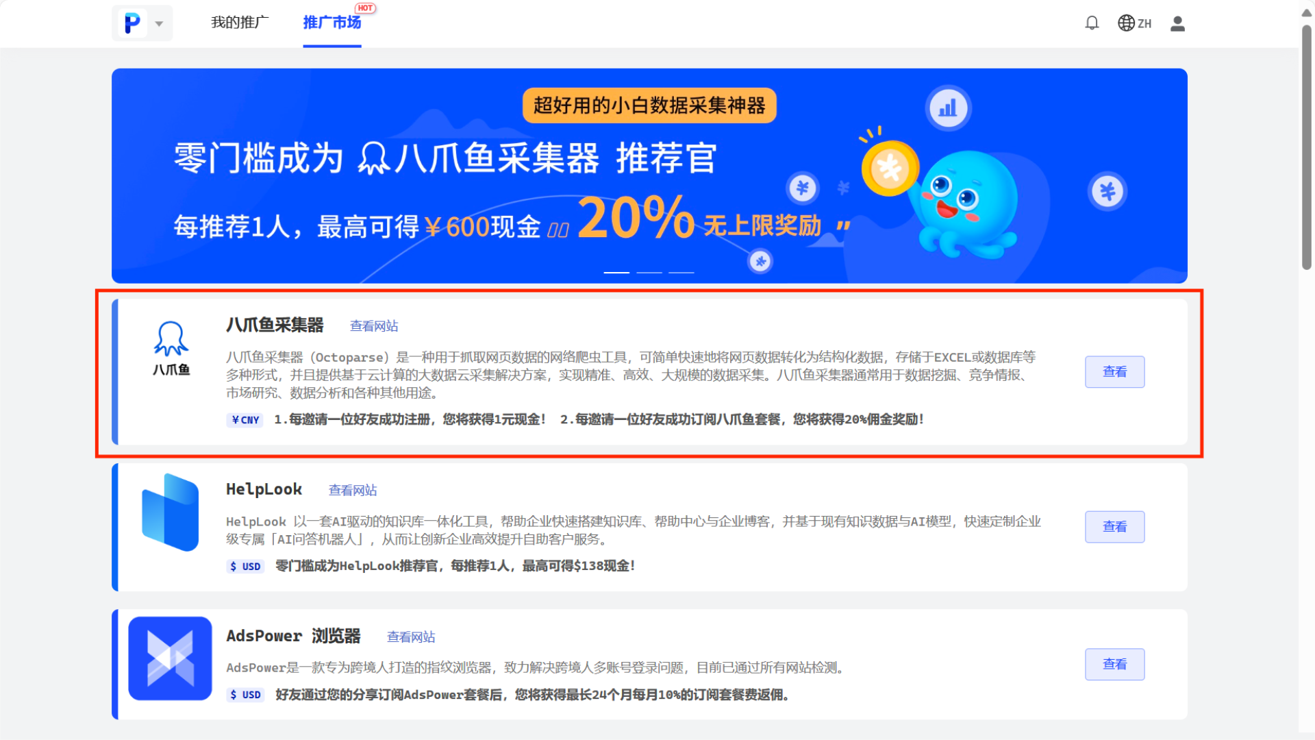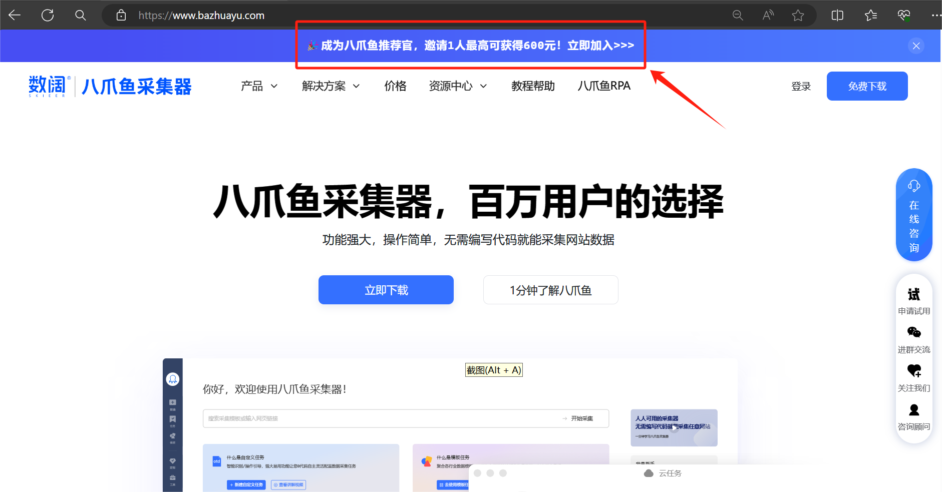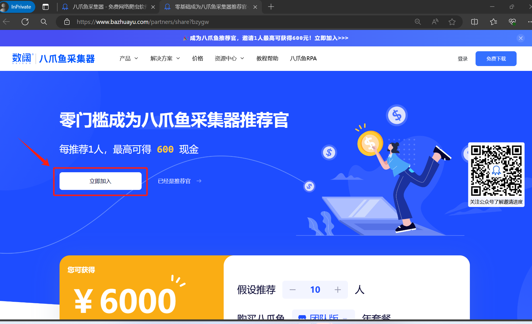 通过PartnerShare平台,八爪鱼采集器开启了联盟计划,邀请各类合作伙伴加入推广行列。在八爪鱼采集器的官网页面上方看到“成为八爪鱼推荐官,邀请1人最高可获得600元!立即加入”的引导横幅,点击后即可跳转到八爪鱼采集器推广计划的专属落地页。