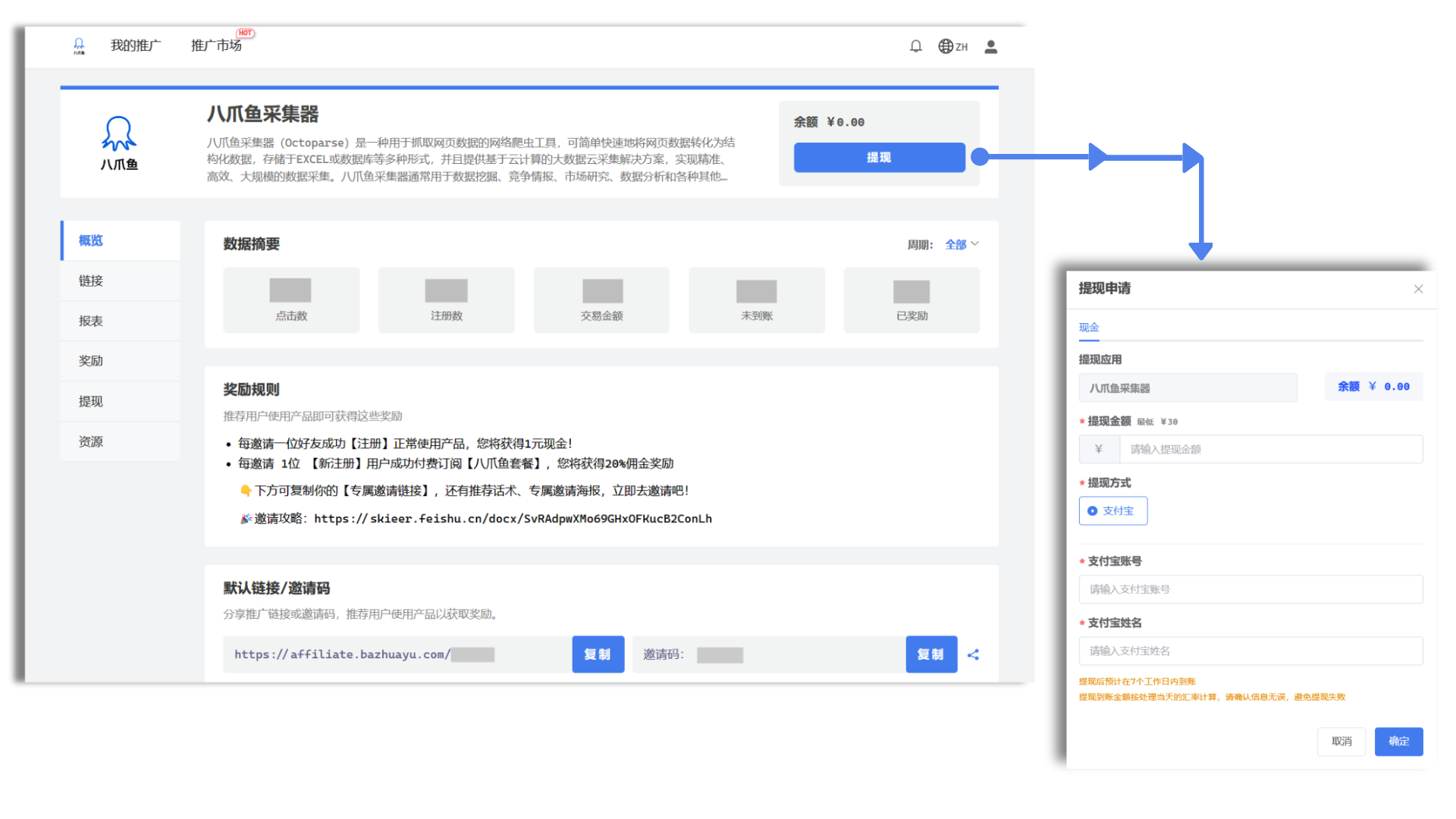 合作伙伴开启推广后,PartnerShare联盟系统会追踪八爪鱼合作伙伴的推广行为,并对推广数据进行自动归因。若有新用户通过点击邀请链接或输入邀请码进行注册购买,只要达到了八爪鱼采集器设定的奖励条件,余额也会同步,合作伙伴可随时随地申请提现。点击成为推荐官