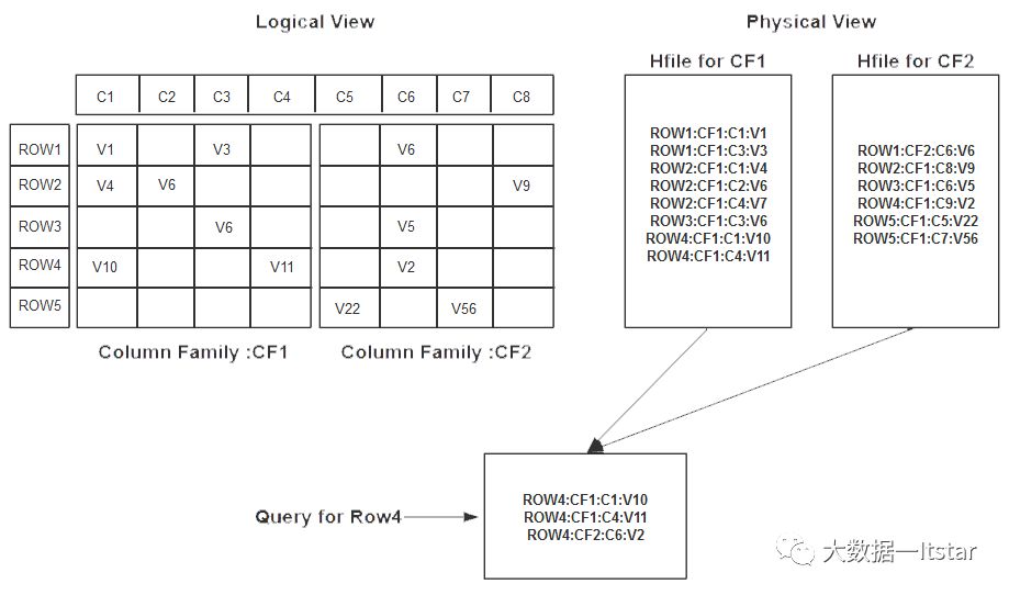 从图中我们看到 Row1 到 Row5 的数据分布在两个 CF 中,并且每个 CF 对应一个 HFile。并且逻辑上每一行中的一个单元格数据,对应于 HFile 中的一行,然后当用户按照 Row-key 查询数据的时候,HBase 会遍历两个 HFile,通过相同的 Row-Key 标识,将相关的单元格组织成行返回,这样便有了逻辑上的行数据。讲解到这,我们就大致了解 HBase 中的数据排布格式,以及与 RDBMS 的一些区别。