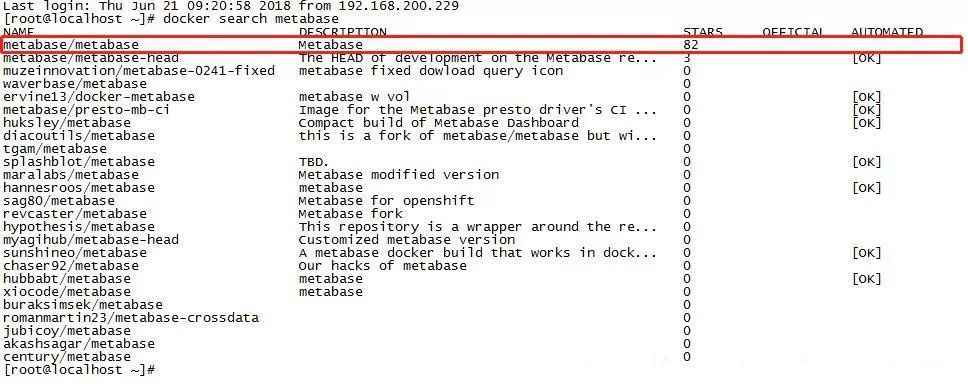 2、使用命令“docker search metabase”搜索可用的metabase镜像;