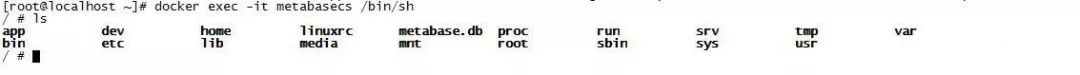 6、使用“docker exec -it 容器名 /bin/sh”命令进入容器内部,使用“ls”命令查看容器内部的目录;