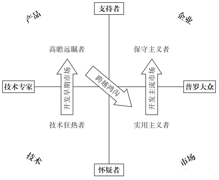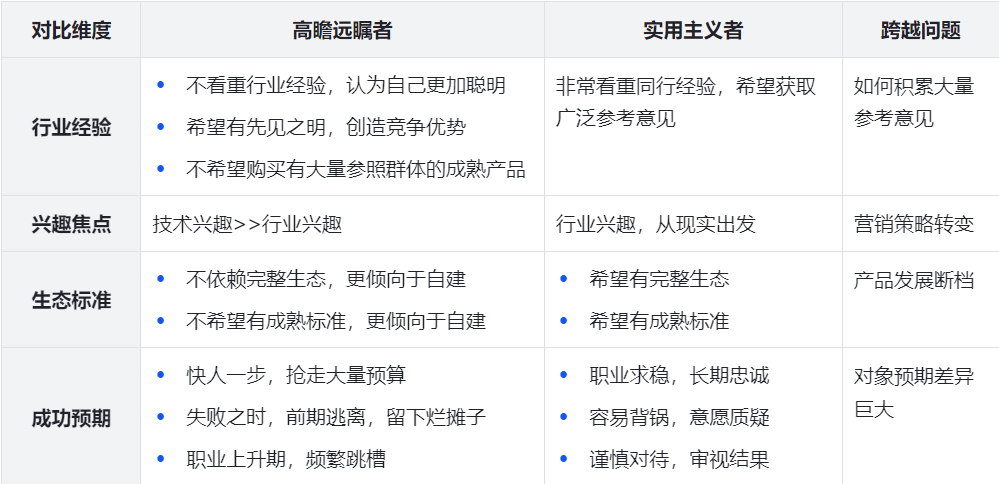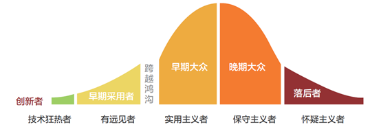 从上表可见,实用主义者再决定购买时,不会基于参考高瞻远瞩者的意见,因此鸿沟天然出现了。如果企业针对高瞻远瞩者的营销取得成功后,没有及时转型,过度宣扬前期取得的傲人成绩,并不能取得好的效果。实用主义者想听到的是符合“行业标准”,而企业却在宣传产品如何“先进”。