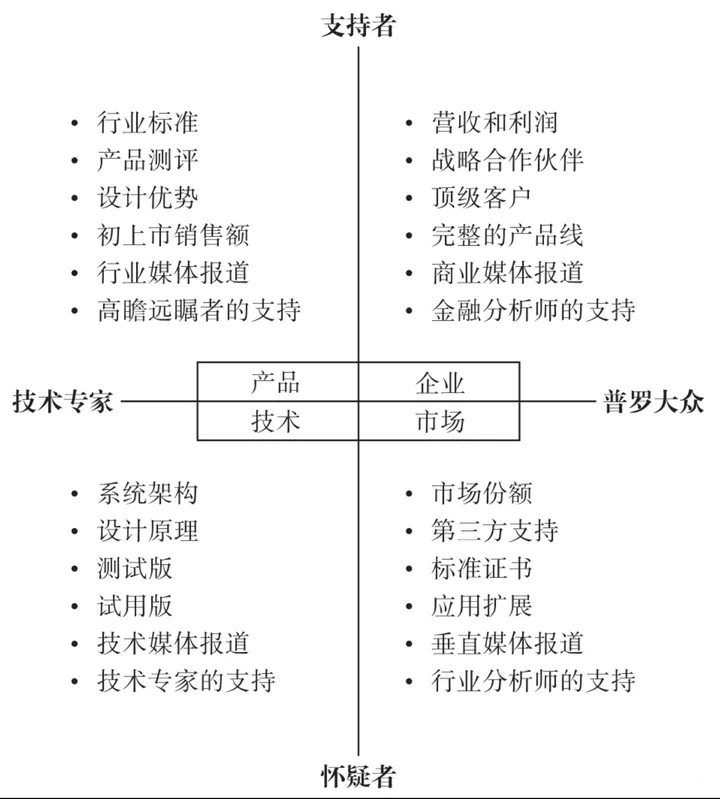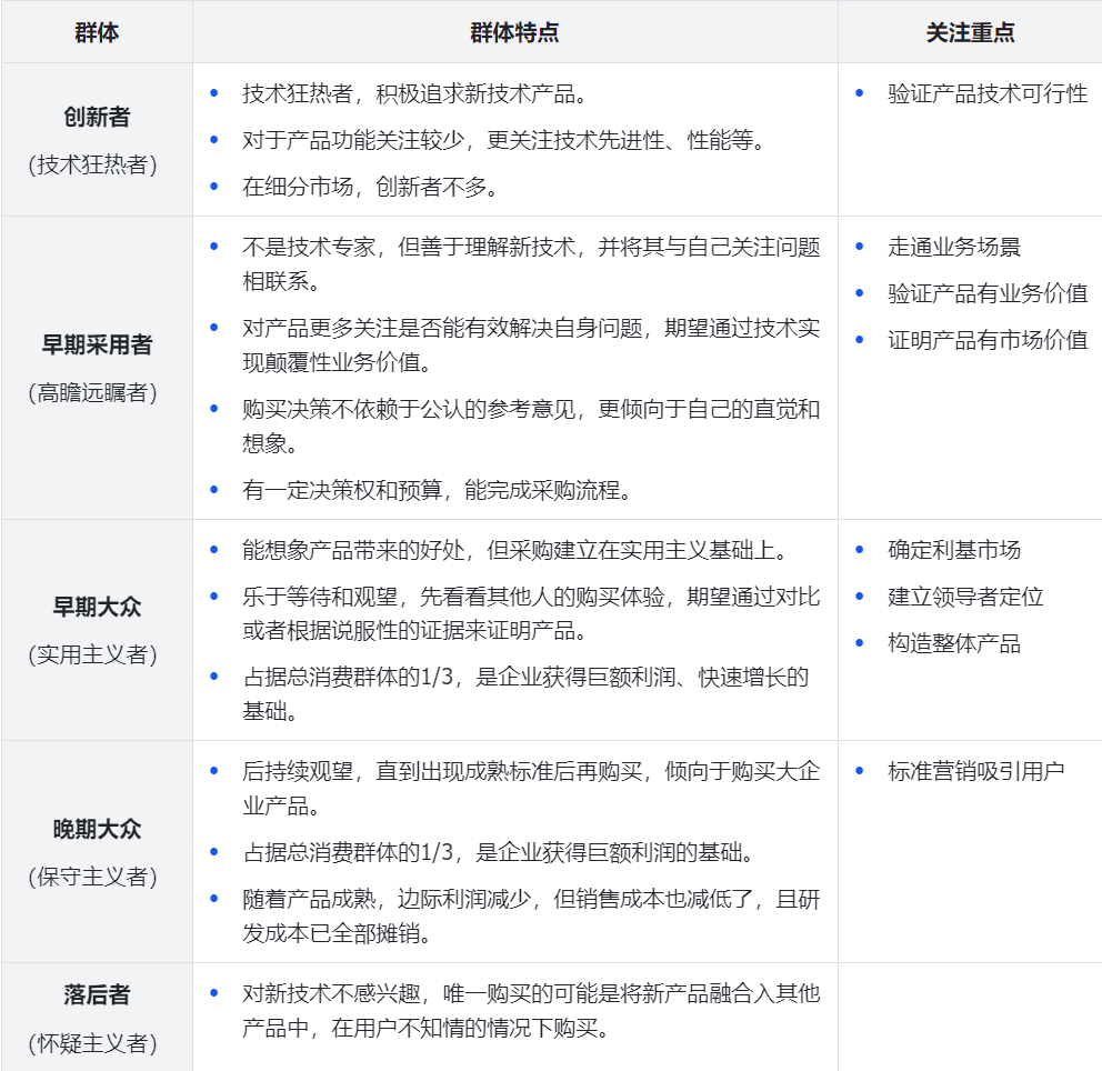 在展开之前,我们先谈下营销目的。营销就是开拓并塑造一个真实存在的市场,而不是创造虚假的幻象。针对高科技市场,我们的定义是:由一群现有或潜在的客户,在面对一系列特定的产品或者服务是具有共同的需求或者渴望,并在做购买决策时会相互参照的群体。最后一点很重要,如果两个人因为同样的原因购买同样的产品,但是他们不会参考对方的意见,那么这两个人就不属于同一个市场。如果客户群体互不参照,那么多么高明的营销方案都无法实施。我们可以将市场理解为一种“分类”,所谓细分市场也蕴含了自我参考的意思。细分市场的自我参照程度越高,传播渠道就越封闭,出现连锁反应的机会就越大。下面我们将市场分为早期市场和主流市场,今天讨论的跨越鸿沟正是从早期市场走向主流市场的过程。早期市场主要是由创新者(技术狂热者)和早期采用者(高瞻远瞩者)构成。在最终拍板决定购买新产品的是高瞻远瞩者,但是首先认识到产品具有巨大潜力的是技术狂热者。比较理想的情况首先是创业公司拥有一款突破性技术产品,能够实现强大功能的新应用;其次需要有一个技术狂热者,能够评估和推崇该产品相对于其他现有产品的优越性;最后要有一个“不差钱”的高瞻远瞩者,能够预见采用新产品可能带来的数量级改进。他们通常比较内向,喜欢谈论技术。当推出一个新产品时,他们会最先发现其技术亮点,同时也懂得与市场上其他产品对比有哪些竞争优势。他们可以原谅产品的各种不完美,他们真正想要的只是推动技术进步。大部分情况下,技术狂热者的影响力不足以决定其他群体的购买决策,他们本身无法构成一个规模化的市场。相反,他们只是试验台,用来测试产品或服务的初始功能,或者修正产品和服务的漏洞。他们是一种罕见的人才,能明察秋毫,能够从新兴技术中找到战略机遇;他们天赋异禀,能够把洞察到的先机转换为高知名度、高风险的项目;他们号召力非凡,能够激励公司全体成员对项目深信不疑、全力以赴。高瞻远瞩者追求的不是小小的改善,而是根本性的突破。他们会冒着巨大的商业风险采用当时还未经证实的新技术或初创企业产品。高瞻远瞩者与技术狂热者不同,他们关注的价值不在于技术本身,而在于借助这种技术能够实现的战略飞跃。针对这一人群营销策略上,要做好期望值管理,借助小规模、高级别的直销队伍即可。另一点有趣的是,一般不是你找他们,而是他们找你。更为有趣的是,他们之所以能找到你,是因为他们跟技术狂热者保持了良好关系。主流市场是由早期大众(实用主义者)和晚期大众(保守主义者)组成,前者通常被后者接收为领导者。实用主义者的目标通常是一点小小的改善(渐进的、可衡量的、可预见的),这与高瞻远瞩者不同,后者则希望是一种颠覆性的飞跃。争取到实用主义者的确不容易,但一旦赢得他们的青咪,他们会变成无比忠诚的客户。他们会一直使用产品,并在很长时间内不更换。实用主义者更多是与相似的人交流,非常重视参照群体和信任关系。除非你已经确立了市场主导地位,否则实用主义者不会轻易选择你的产品;而无法购买就无法确定主导地位,非常矛盾。实用主义者关注的点是首先是产品存在竞争,这样有利于控制成本;其次产品存在竞争,这样出现问题时可选择其他企业产品;最后是购买的产品来自市场领导者企业,只有这样才有完善的生态。保守主义者购买产品的真正目的往往只是不希望自己被怠慢,这就需要找个合适的理由说服保守主义者去购买你的产品。一种比较常见的形式就是打包处理,将功能捆绑在一起,在不知不觉中卖给保守主义者。这部想要成功有两个关键因素,一是考虑周全、针对特定目标用户提出“整体解决方案”;二是建立低开销的廉价分销渠道,有效将这种软件包推向目标市场。作为最后一个组成部分,能做的营销的首要目标就是消除负面影响,不要有太多奢望。4).跨越鸿沟基本原则
