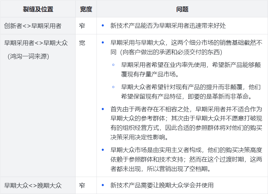 在上述模型中任何两个相邻的群体之间都出现了一个裂缝,即两个群体之间出现分裂。也就是说,对于任何两个相邻的群体,如果向右边群体推销新产品的方式与左边群体推销方式一样,则右边群体很难接受这一新产品。每到一个裂缝时期,营销活动都可能失去前进的势头,错失从一个细分市场顺利过渡到下一个细分市场的时机。这里我们将曲线上的裂缝总结为“一大两小”三个裂缝。