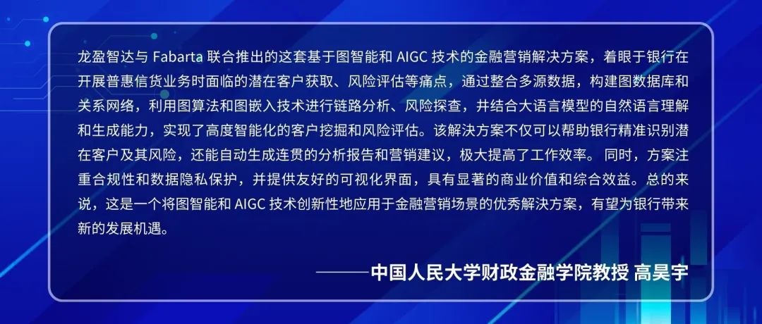 近期,由金科创新社主办、全球金融专业人士协会支持的“2024 鑫智奖·第六届金融数据智能优秀解决方案”评选结果正式揭晓。龙盈智达与枫清科技(Fabarta)联合申报的“基于图智能和 AIGC 技术的金融营销解决方案”荣获“大模型应用创新优秀解决方案”及“专家推荐 TOP10 优秀解决方案”两项奖项。
