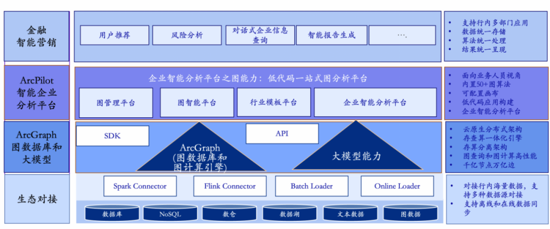 在金融行业营销活动中,如何获取潜在客户及判定企业风险是银行重点关注的方向。“基于图智能和 AIGC 技术的金融营销解决方案”主要面向小微企业或个体户融资场景,运用图智能和 AIGC 等技术构建金融企业营销业务系统,根据中小企业的企业基本信息等多维度数据构建精准银行客户风险画像,帮助企业精准筛选潜在客户,通过股权穿透、实控人分析自动识别风险。通过大模型企业知识中台,用户可以利用自然语言对话的方式查询企业信息、自动生成风险报告和营销建议。本方案可以帮助金融企业全面提升营销能力,更加精准有效地为资质优良的中小企业提供贷款融资服务。
