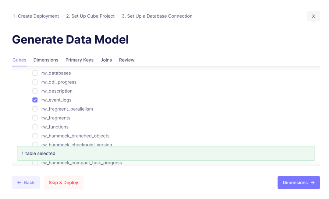 开发一个数据应用,那么第一步我们需要为其封装一个 GraphQL 接口,避免前端直接访问数据库。在 Cube Cloud 控制台内选择“生成数据模型”,选择需要绑定的表,导入之后该表自动就拥有了一个 GraphQL API,无需编写任何代码。