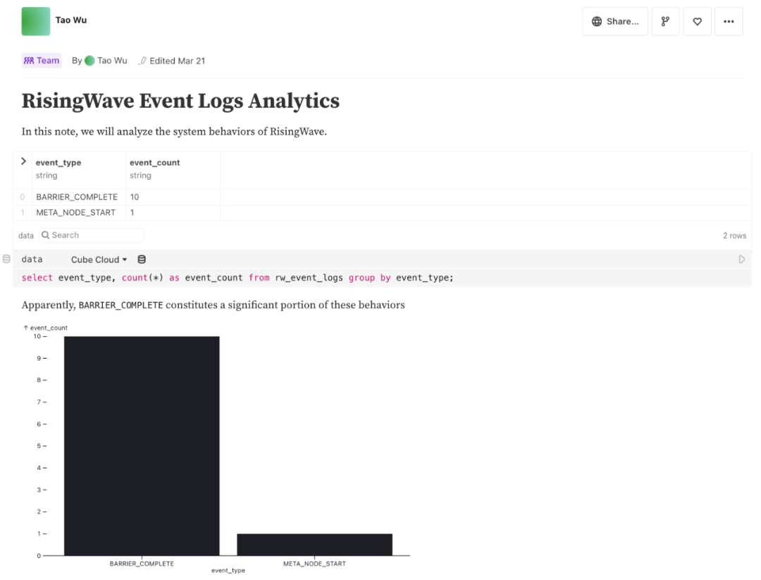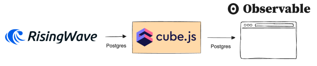 另一方面,Cube.js 也使得 RisingWave 的用户得以尝试许多新兴的工具,例如 Observable。在本文编写前,由于缺失一些系统表功能,RisingWave 尚未完整支持 Observable,但我们可以略微变通,借由 Cube.js 来代理,从而实现这一集成。