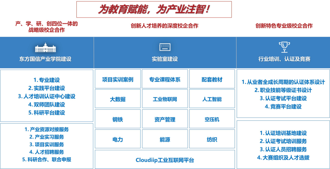 在全社会都亟需提高大数据素养的强烈需求与环境背景下,东方国信以产业化公司的核心定位,不断赋能产教融合实践,将产业化实践过程中积累的技术、方法、案例、产品进行赋能,通过岗位能力倒推课程与培训内容的逻辑真正帮助学校培养产业所需要的数字技能人才。