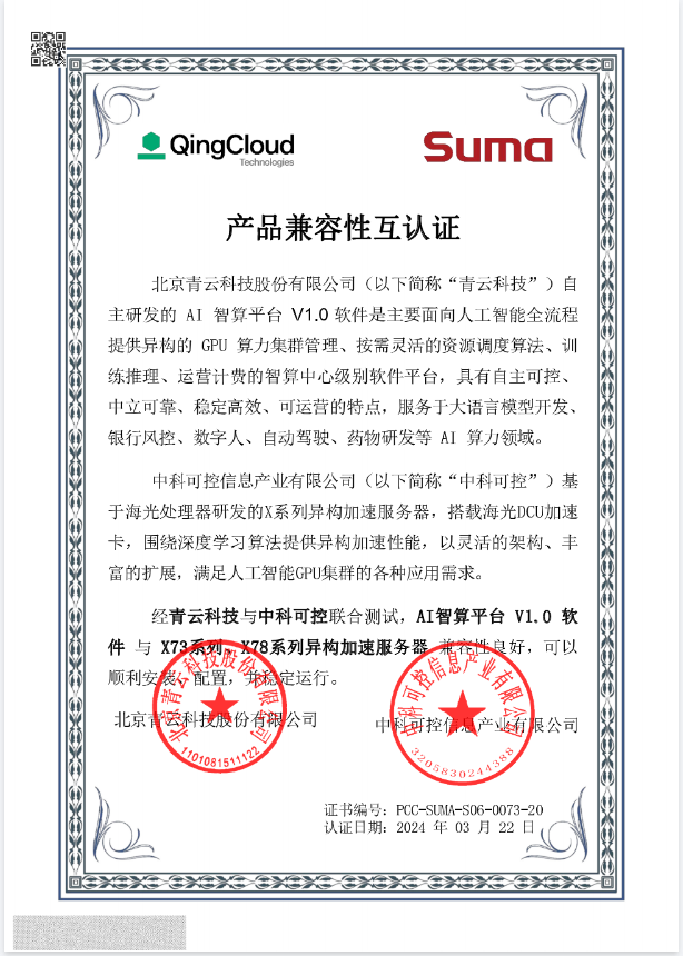 青云科技与中科可控信息产业有限公司(以下简称“中科可控”)通过联合测试!青云 AI 智算平台与中科可控 X73 系列、X78 系列异构加速服务器兼容性良好,可以顺利安装、配置,并稳定运行。双方经过此次认证,确保青云 AI 智算平台与 X73 系列、X78 系列异构加速服务器之间的软硬件无缝兼容,为用户提供更加稳定、高效和可靠的 AI 算力服务。青云 AI 智算平台是主要面向人工智能全流程提供异构 GPU 算力集群管理、按需灵活的资源调度算法、训练推理、运营计费的智算中心级别软件平台,旨在提高资源利用率,简化部署流程,满足各类复杂任务需求。中科可控基于海光处理器研发的 X 系列异构加速服务器,搭载海光异构加速卡,围绕深度学习算法提供异构加速性能,以灵活的架构、丰富的扩展,满足人工智能 GPU 集群的各种应用需求。此次互认证,青云科技与中科可控不仅验证了双方产品技术的先进性和可靠性,实现了技术层面的双赢,更是国产科技生态合作的里程碑,通过技术的融合创新,为行业发展注入了新活力,也让企业能够更加便捷地选择和部署双方的产品,降低了系统集成和运维的复杂度,为企业数字化转型与智能化升级铺设了高速通道。展望未来,青云科技与中科可控也将在政府、金融、能源、交通、运营商、电力、教育、制造、医疗等多个行业领域展开深度合作,共同为客户提供更加全面、高效的解决方案,加速推进社会各领域的数字化转型进程,共同见证国产科技生态的蓬勃发展与无限可能。