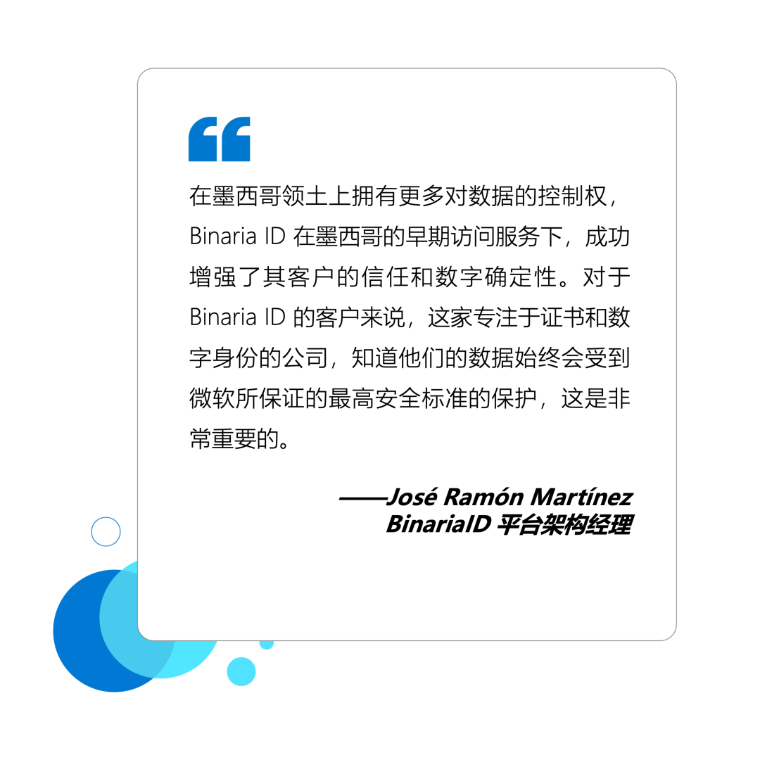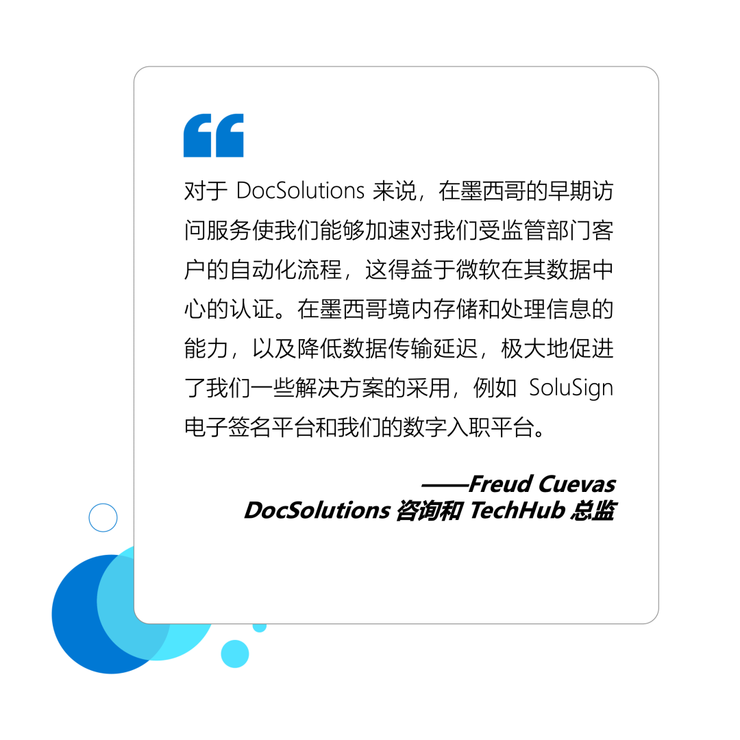 成千上万的墨西哥客户和合作伙伴已经开始利用微软云服务推动业务转型。它们包括来自各个行业的学校、大学、组织和公司。微软的超大规模云数据中心区域开始运营,与一些客户合作,例如Binaria ID和DocSolutions,他们已经开始体验这一基础设施带来的好处: