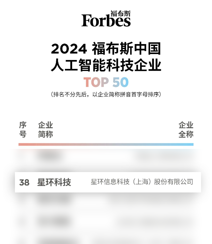 近日,福布斯中国公布“2024福布斯中国人工智能科技企业TOP 50”评选结果。星环科技凭借在人工智能及大模型领域的卓越表现,成功跻身榜单,再获行业权威认可,展现了其在人工智能大模型领域的强大实力和创新能力。
