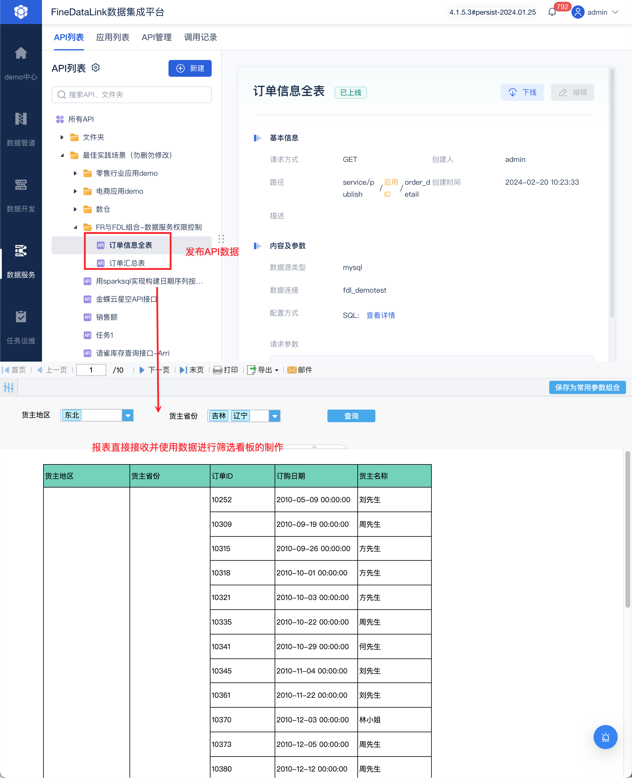 参考文档: Ø 详情请参见:按日期分表,每天保存当天数据 使用FDL接口形式实现阿里云服务器数据监听应用场景: 用户需要对阿里云产品进行数据监控,实时掌握服务器性能情况。由于阿里云服务器签名认证很复杂,官方文档仅提供代码形式来获取签名。比如python或者java,且由于代码是开源的,扫描会有安全漏洞的风险。 因此用户希望能提供更简便安全的方式对产品进行数据监控。 参考文档: Ø 详情请参见:使用FDL接口形式实现阿里云服务器数据监听 FineReport接收并使用数据服务发布的数据应用场景: 用户为保证数据安全,不希望直接将数据仓库账号开发给第三方使用,且拥有 FineDataLink 作为数据中台,想使用「数据服务」功能,统一分发数据给第三方使用,同时想要使用 FineReport 直接接收数据制作看板。