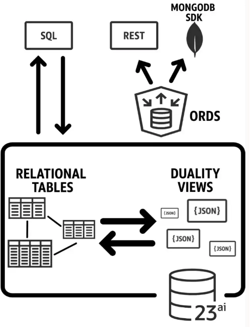通过在关系表之上创建简单的 JSON Duality 视图,用户可以构建起用文档来查询并更新基础数据集的应用程序。这不仅避免了文档建模中的一个基本问题——数据重复,甚至能够将数据库级的并发控制复杂性隐藏起来,由 Oracle Database 23ai 代表用户管理文档级可串行性。大家可以继续使用简单的 HTTP PUT、POST 及 GET 操作,或者直接针对 Oracle Database 使用特定语言的 API,例如 Oracle SODA API 甚至 MongoDB API。有了 JSON Duality Views,“鱼与熊掌不可兼得”将彻底成为历史。