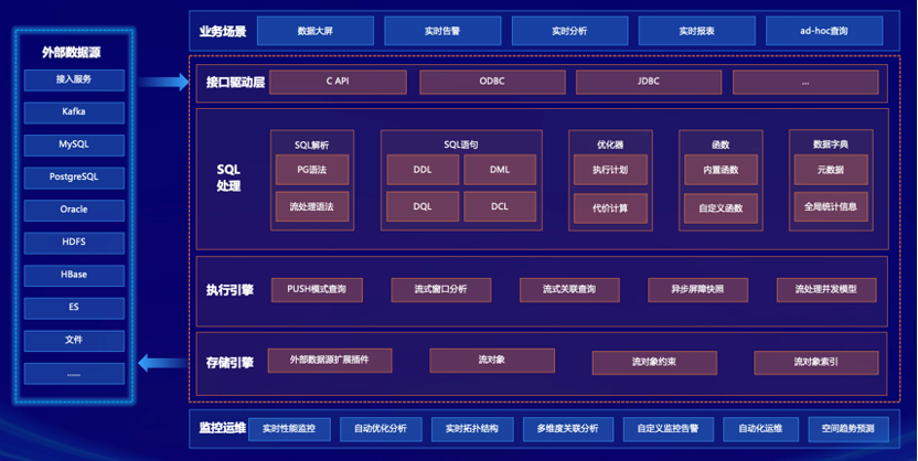 上图这是流式数据库系统的核心功能架构图,从图中可以看到流数据库包括“存储引擎”、“执行引擎”、“SQL查询引擎”以及“接口访问驱动层”等几个部分。