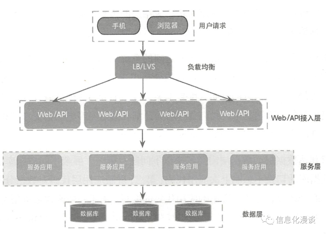 单个业务功能需要拆分至多台服务器,软件系统可以向MVC等架构延展,一般会有展现层、业务逻辑层、数据层。