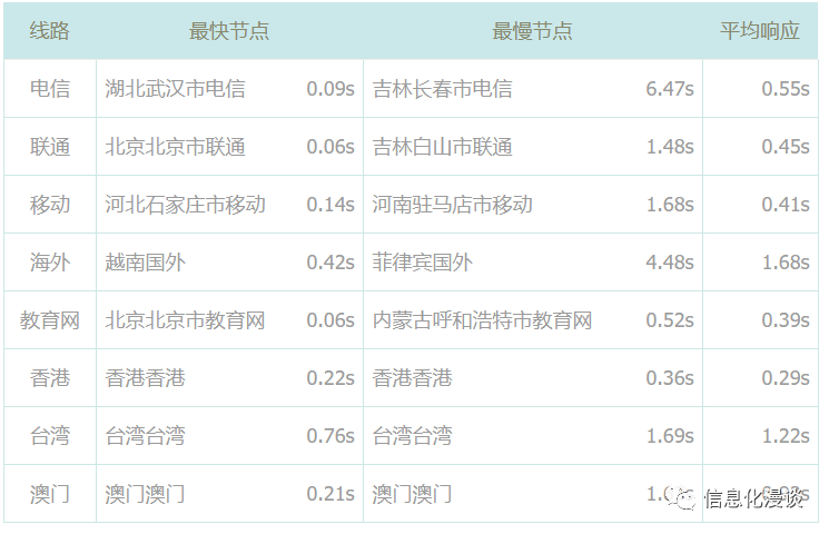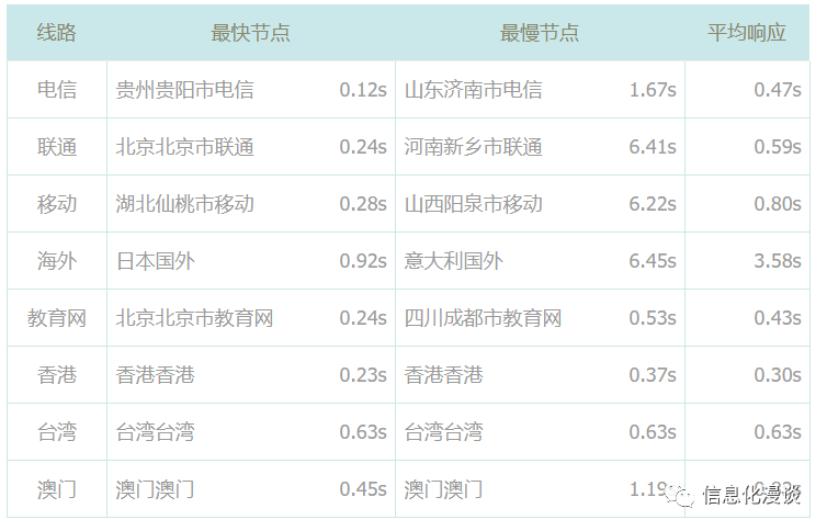 我们在几秒钟时间得到了基本是全球的数据测试结果,电信、联通、移动网的访问体验差异不大,在海外的速度稍慢。